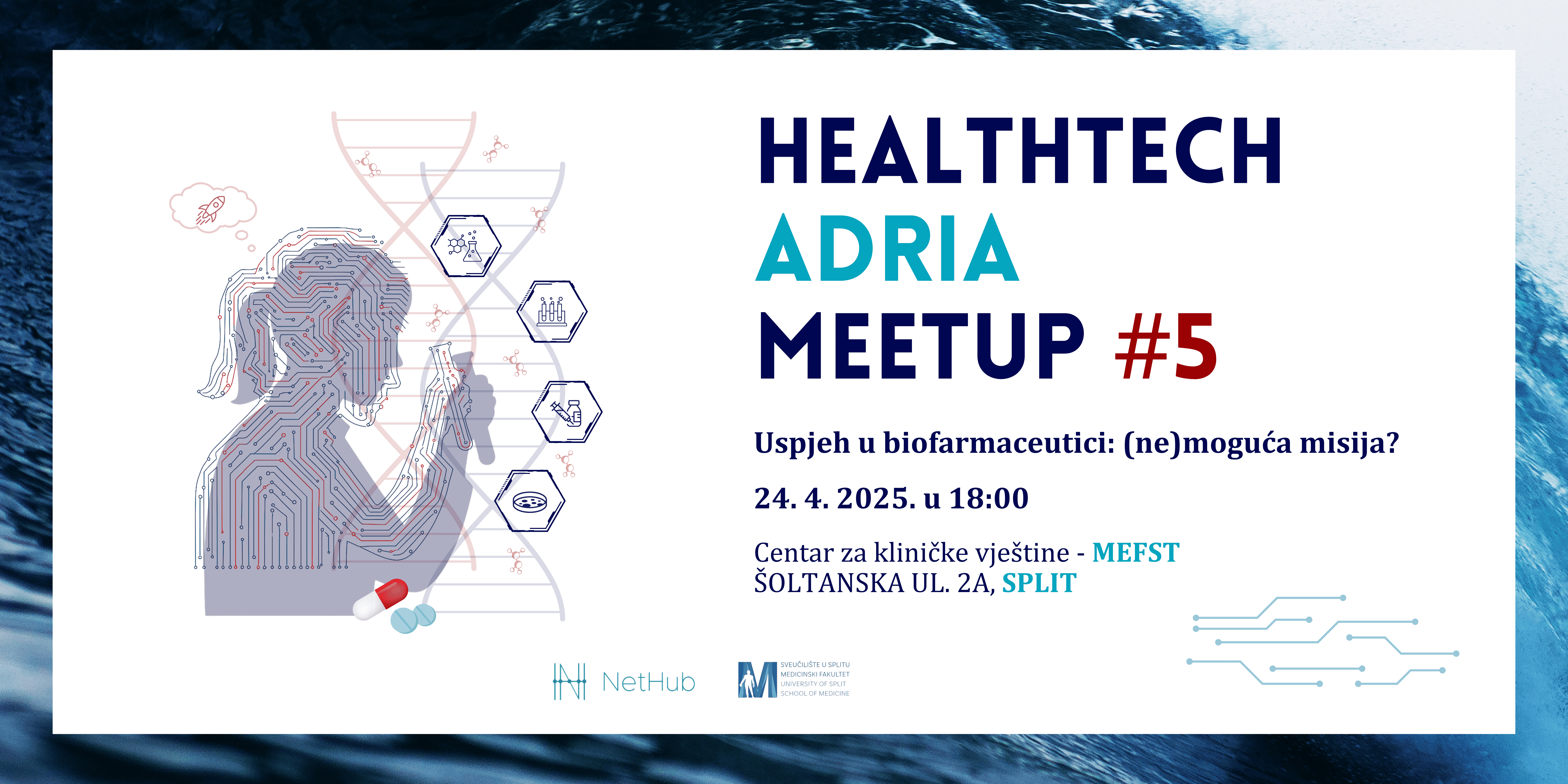 U četvrtak, 24. travnja 2025. u 18 sati, NetHub akcelerator i Medicinski fakultet u Splitu organiziraju peto izdanje Healthtech Adria Meetupa, ovog puta na temu izazovnog puta do uspjeha u biofarmaceutici.