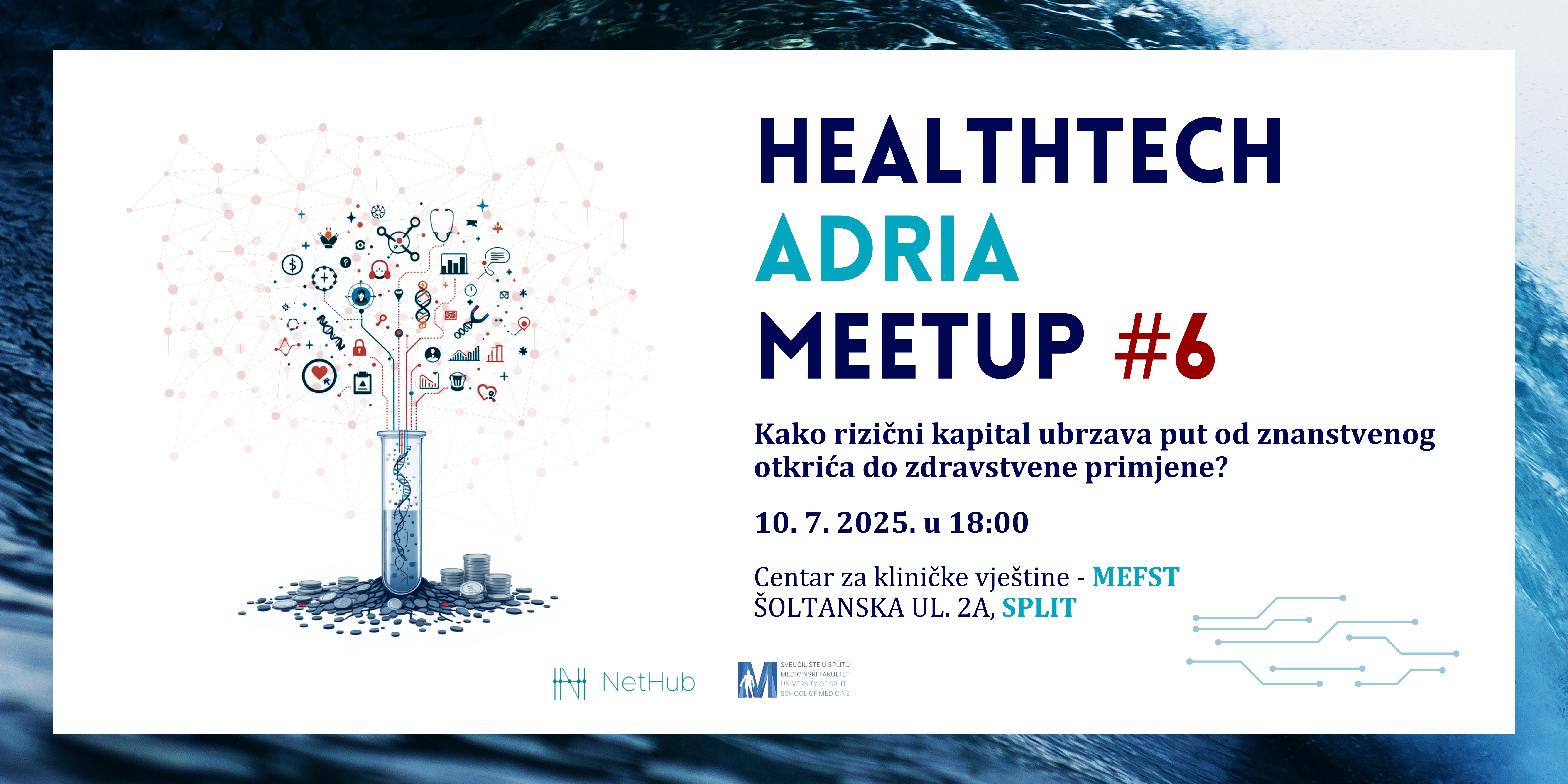 U četvrtak, 10. srpnja 2025. u 18 sati, NetHub akcelerator i Medicinski fakultet u Splitu organiziraju šesto izdanje Healthtech Adria Meetupa, ovaj put na temu uloge rizičnog kapitala u ubrzavanju puta od znanstvenog otkrića do zdravstvene primjene.